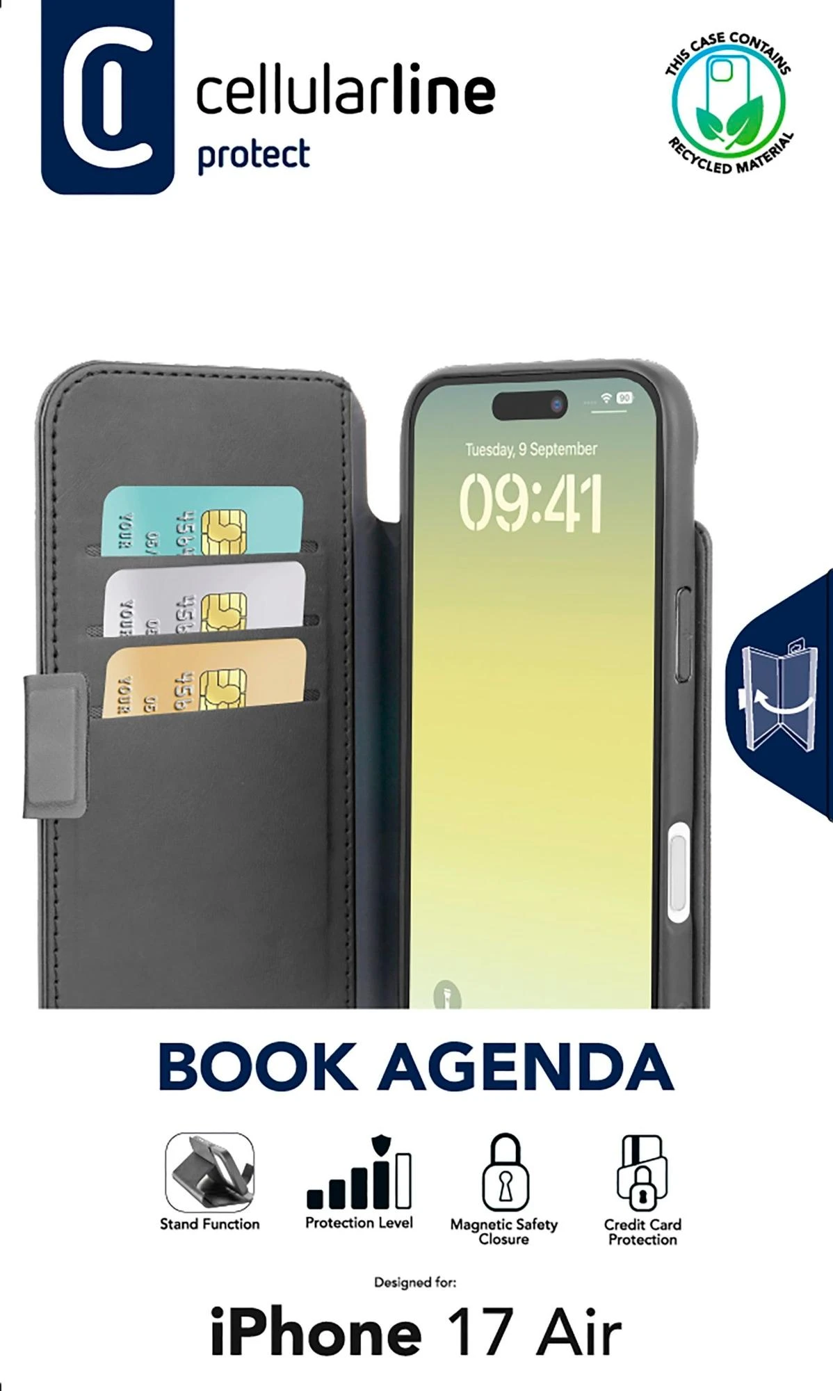 Book Agenda ist das funktionale und dennoch elegante Etui im Buchstil mit Magnetverschluss und Kunstleder-Finish. Es verfügt über praktische verdeckte Kartenhalterfächer mit „RFID & NFC Block“-Technologie, um das unbefugte Scannen von kontaktlosen Karten zu verhindern. Mit der Standfunktion können Sie bequem Videoanrufe tätigen oder Videos ansehen. Es ist mit der antibakteriellen Microban-Technologie hergestellt, die bis zu 99,9 % des Bakterienwachstums auf der Oberfläche der Hülle abtötet und ständig aktiv bleibt, da sie in das Material der Book Agenda-Hülle integriert ist.